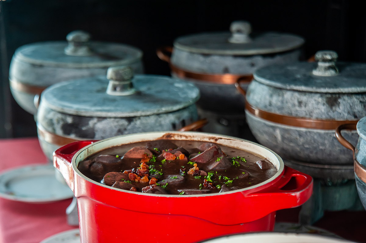 Na feijoada feijão preto, lombo de porco, carne de sol, linguiça calabresa, linguiça paio, orelha de porco, pé de porco, costela de porco, língua de boi e rabo de porco.