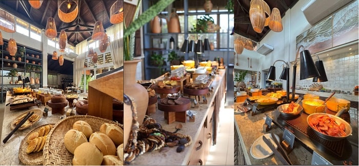 Decorado com louças que realçam as cores e texturas dos alimentos, a apresentação valoriza a estética e o artesanato local, tornando a experiência sensorial completa: o aroma do café passado na hora se mistura ao perfume dos pães assando e das flores frescas nas mesas. O serviço, atento e discreto, reflete a hospitalidade primorosa do hotel, que já se manifesta na chegada com o ritual do “Oshibori” – toalhas frias aromatizadas – e do coco fresco.