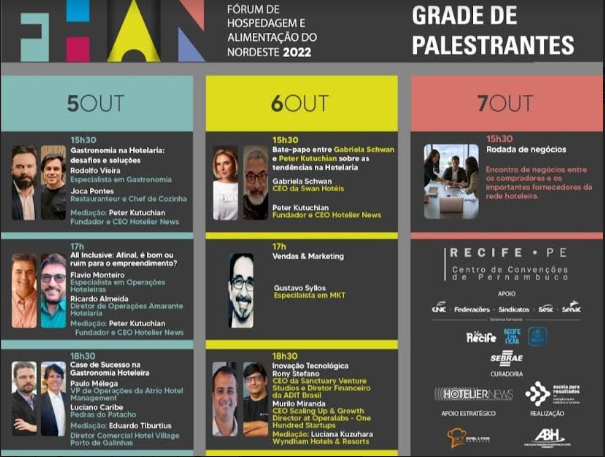 As discussões serão iniciadas no dia 5 de outubro com o painel “Gastronomia na hotelaria: desafios e soluções” (15h30), com o especialista em gastronomia Rodolfo Vieira e o chef pernambucano Joca Pontes, seguido por uma discussão sobre o sistema all inclusive (17h), com o especialista em operações hoteleiras Flávio Monteiro e o diretor da Amarante Hotelaria, Ricardo Almeida. Ambos mediados pelo CEO da Hotelier News.