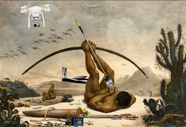 Colagem digital “Para as estratégias de sobrevivência as maiores tecnologias são as nossas” (2020), Série “Atualizações traumáticas de Debret”.Acervo da artista/Cortesia da Lima Galeria