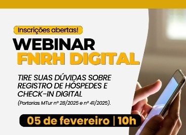 O encontro esclarece dúvidas sobre como implementar as diretrizes da Portaria MTur nº 28/2025 (regras de entrada e saída, diária de 24h, deveres de informação ao hóspede) e da Portaria MTur nº 41/2025, que institui a Ficha Nacional de Registro de Hóspedes (FNRH) em meio digital e dispõe sobre a Plataforma FNRH Digital, substituindo a ficha em papel em todo o território nacional. O webinar contará com a participação de servidores do Ministério do Turismo responsáveis técnicos pela FNRH — Angela Cascão, Larissa Thewes, Mario Rudá e Hudson Queiros — além de Flávio de Melo, responsável pela FNRH no Serpro.