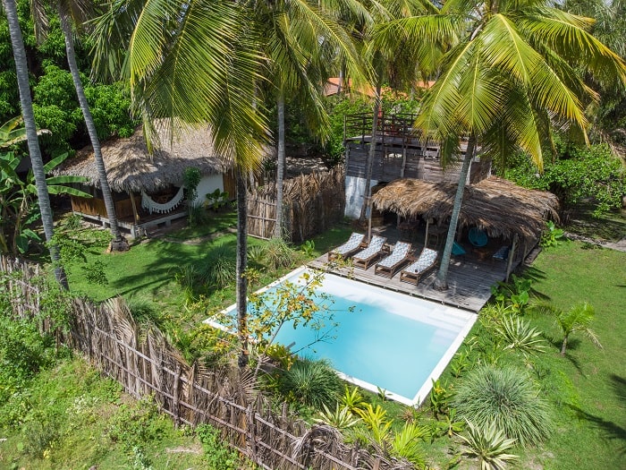 Com arquitetura autoral e integrada ao bioma, a pousada foi construída com materiais da região, como a palha de carnaúba que reveste os tetos. Uma escolha que reduz os impactos da extração e o transporte de insumos de fora. Nenhuma árvore foi derrubada durante a obra, e cada bangalô foi projetado para favorecer a ventilação cruzada, aproveitando os ventos naturais e eliminando a necessidade de ar-condicionado.