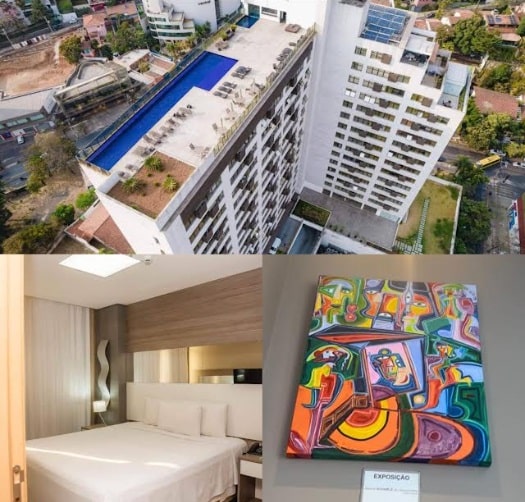 A estrutura do hotel impressiona tanto quem viaja a lazer quanto a negócios. Sua cobertura oferece uma vista panorâmica deslumbrante da cidade, acompanhada de uma piscina de borda infinita que proporciona momentos únicos de relaxamento. O espaço fitness, equipado com aparelhos modernos e de última geração, garante a manutenção da rotina de treinos mesmo fora de casa. A sauna e as áreas de convivência completam o ambiente de bem-estar e lazer. Para tornar o espaço ainda mais acolhedor e exclusivo, o hotel exibe obras da artista Joanna Scharlé de Vasconcelos (@scharle_joanna_vasconcelos), agregando arte e sofisticação à experiência dos hóspedes.